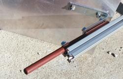 One of the two rails were taken to the November 2002 launch for use, but we ran into a snag. The problem was with the square tube of the launchers - there’s a weld line along one side inside the tube where the ends were brought together. These pads are the excellent Wasp pads from Yellow Jacket Systems, and rated to take up 3/8-inch rods. They will almost take a half inch one. So we weren’t able to use it that weekend. After the launch I took the new rail and one of the pads home for adjustments. By grinding a flat spot on the rods under the bolts they were made to fit nicely.