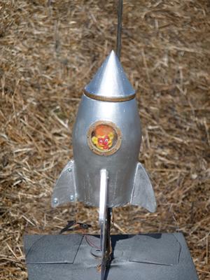 I decided to keep a rough look so I filled only a few deep dings and the rough fin edges. I shot a coat of primer, not to fill the grain but to provide a uniform color base. I then painted the body silver. The ring on the cone and around the open hole are gold. The Raygun Gothic Birdhouse has a Creeple Peeple pilot behind a clear window held on with small nails. The only suitable plastic that I had isn't really that clear, but it is easy to replace later.