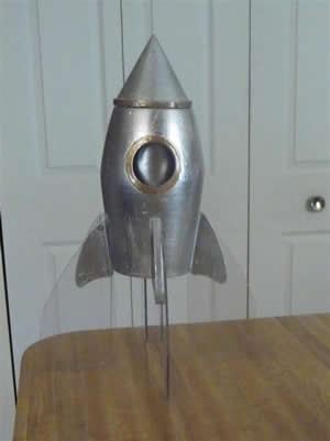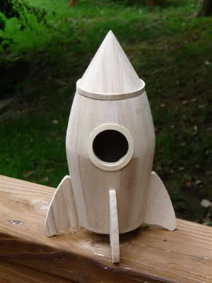 When I found these rocket-themed birdhouses at Michael's, I couldn't resist. In fact, they were on sale so I couldn't resist three of them. They are about 10" high, 4.25" in diameter that the widest point, and the base is about 3.125". This review is of a sci-fi themed rocket inspired by, and named for, the Raygun Gothic Rocketship that appeared at Burning Man 2009. This one flies on high impulse 24mm motors - the E30 SU, F24 RMS, or F39 RMS.