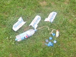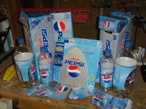 When I considered the idea of building a rocket from recycled household trash, I immediately thought of building one entirely out of Pepsi products. Pepsi bottles look rocket-like so I began to consider how to build it. First I collected raw materials for the project (there is no shortage of raw materials in our house).