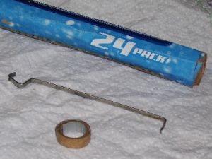 The stuffer tube and engine block were made from cardboard from the cartons and so were the fins. On the advise of a friend from The Rocketry Forum, I made the engine hook from an old windshield wiper. I couldn't find anything with a Pepsi logo on it for a parachute so I used a Hobby Lobby bag instead.