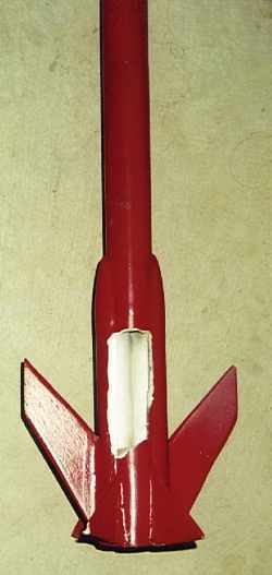 After lengthening the body, replacing two small fins and 1 large one, and hitting it with red paint again she was ready to fly. This time on two B6-6's and using a streamer for recovery.