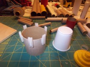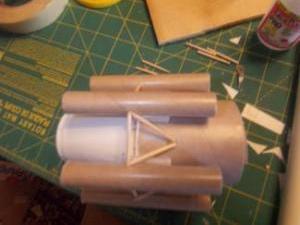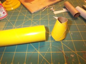 The capsule was the hardest to build the main part is a piece of the BT-70. The "Shoulder" was made from splitting part of the BT-70 and gluing to the inside. The "nosecone" is made from a small plastic cup. The cub was a slightly smaller diameter than BT-70. Some cardboard tabs were used inside to reinforce the joint.