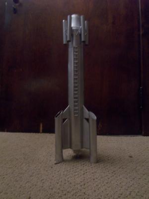 Since I didn’t get any decal paper, the lettering would prove to be a challenge. The sides of the rocket were base-coated in black. Peel and stick letters were applied. A single coat of silver finished the Vulture. The stick on letters were then removed to reveal the name in black.