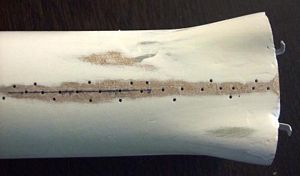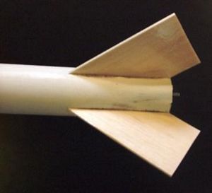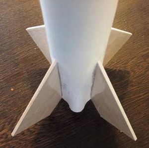 The body tube had some spiral grooves in it, which were filled with model filler, and then the BT was spray paint primed, sanded, primed, sanded, primed etc. As the fins are not TTW and with four C6 motors to power this rocket, it was going to move quite fast and I was a little concerned about the strength of the fins, coupled with the fact that swept back fins have a habit of meeting the ground first when landing. To overcome this, I put several holes along the area where the fins were going to be attached. The fins were then added using CA gel. Four glue fillets were then added over two days.