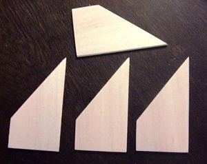 I decided to make the fins slightly swept back mainly because of the mass from the motors. The fins were laminated using Fablon, which was a first for me. The Fablon plastic went on well. The leading edge was not beveled and left square. The edges were sealed with white glue.