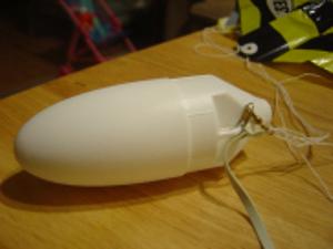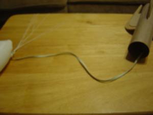 Once all three sections have been glued to each other, bend the mount into a U shape so it will be easier to glue to the body tube. Tie the other end of the shock cord to the nosecone. Secure shock cord to the nosecone with CA if desired.