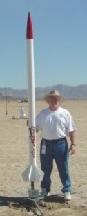 After priming and painting with gloss paint, I applied custom made vinyl graphics. The finished rocket weighs in a just under 10 lbs empty. The picture (above and right) was taken at LDRS XX just prior to a successful first flight, to 5,958 feet on an Aerotech K550.