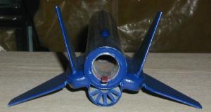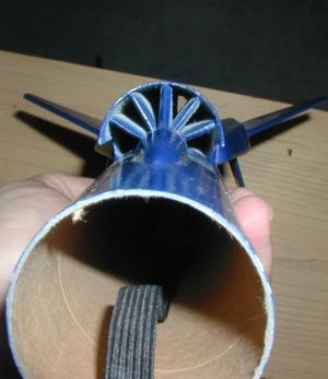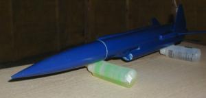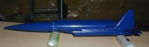 | Conversion of the Mustage Kit: Building the RamJet: Cut each of the (5) vanes of the RamJet from the basswood strips. Following the SLAT/s instructions, cut and sand each vane into the proper shape. Then glue each one onto the 10.5mm body tube making sure the back of the vane is even with the back of the tube. Also each vane edge that attached to the 10.5mm tube should be touching the one next to it. Cut the Icarus body tube to a length of 10-3/4". Once dry, lay this assembly onto the Mustang body tube so that it is hanging off the back. Slide the Icarus body tube over it until it hits the back of the Mustang body tube. Mark where they meet on the Icarus tube. Extend those lines on the Icarus tube and then cut through them lengthwise. Don't use an enlarged guide for these two cuts. You want to make sure that the Icarus tube fits nicely around the vanes and meets with the main body tube. Next, you will need to cut out the front shape of the RamJet using a template. I made my template by going to a copier machine and enlarging the "RamJet Tube Marking Guide" x 1.9x. Then on the front (following the SLAT/s instructions) cut 1.5" lengthwise and 1/4" from the edge to form the front of the RamJet. Mark the Mustang body tube, using an enlarged "Body Tube Marking Guide" and a door jam. Glue the RamJet Vane Assembly and nose cone onto the Mustage body tube using this line as a guide (leave 1/4" from the rear of the rocket). Then glue the Icarus body tube into place on the vanes and the Mustang body tube. Building the Dorsal Conduit: Build the Fin Assembly: Follow the SLAT/s instructions for building the pods. After building the pods, take some sandpaper and attach it to the Mustang body tube. Rub the pods on that sandpaper to form the edge that will be glued to the body tube. Finish assembly of the fins and then glue each one onto the Mustage body tube so that they are touching the edge of the RamJet and so that they are aligned as indicated in the SLAT/s instructions. Finish or . . . . . . Beyond: Prepping the Nose Cone: Building the Electronics Bay: Once the tube is sized and fits right, then a wooden bulkhead will need to be glued onto the top (section that slides into the nose cone). I used a wooden bulk head and a 1.16" thick, 1-1/2" washer on the inside of the tube. I had to use my dremel to size the washer correctly. Drill a hole in the center and mount an large eye-bolt. I used one with a 1" eye, 1/4" thread, and a total length of 2-1/4", along with two hex nuts, one for each size. Don't worry you need the weight. Tie a 40" long elastic shock cord to the eye-bolt on the Electronics Bay and to the Kevlar® coming from inside the nose cone. I used Aerotech's elastic. |