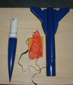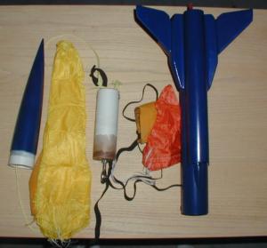 Then place your apogee ejection charge into the rocket body, followed by a Heat Shield and then the parachute.