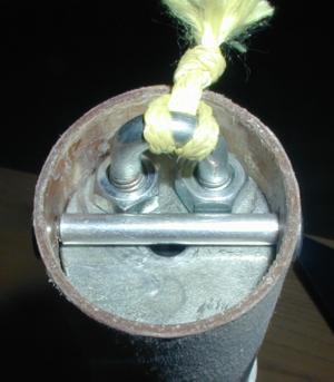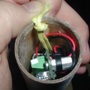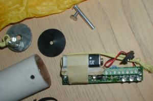 The G-Wiz is the only altimeter that I know of that will fit into this tube. Careful placement of the battery (be sure to tape the battery over so no metal contact is made). Slide the electronics into the bay, place the rubber washer over the top and place the last washer over it. I used a screen door screw across the center to hold it in place.