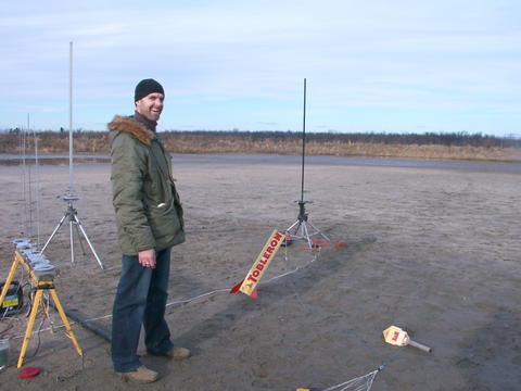 The first flight took place at the Tripoli-Québec launch in St. Pie de Guire, Québec on June 25th, 2006. It was a beautiful, calm day, so I thought I'd finally let 'er rip! I wanted to give it a fairly smooth ride, so I used a G64-7W for the maiden voyage. (Actually, the 7 second delay was a bit long, so I drilled it down to 6.) I also added a pinch more black powder, because I wasn't completely confident with the ejection system. The RI at an earlier launch was worried that the nose cone had serious leaks around the shoulder, so we decided it would be best to come up with a more airtight system.