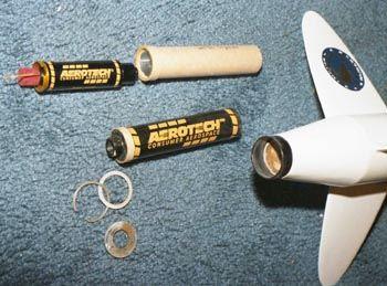 Finally, make a 24mm adapter. Glue the thrust ring flush with one end of the 24mm tube (optional - I use this adapter in other rockets with Estes single use motors using a spacer with 70mm long motors). Draw two parallel lines the length of the 29mm tube spaced about an 1/8-inch apart. Cut the strip between the two lines out of the tube. Glue the 29mm tube around the 24mm tube so that the motor block end of the 24mm tube is flush with the end of the 29mm tube. The 1/8-inch inset is to allow for the thrust ring of the 24mm reload hardware. Trim off one edge of the 29mm tube as needed - it's OK if the two edges don't meet. Test fit the 3/8" band and the washer together in the mount - you should be able to install the retainer clip easily, but there should be little or no slop in the parts. You may need to adjust the size of the 3/8" band to fit your motor retainer depending on how much space you left between the retainer and the motor tube. Trim or cut a larger one as needed. Glue the 3/8" 29mm band flush with end of the assembly opposite the motor block. Drill out the fender washer so that the center hole is larger than any given 24mm RMS motor nozzle - 5/8" should be about right. Use a drill press and a press clamp! To use the adapter, slide the motor into it in the normal fashion, then slide the whole thing, ejection/block end first, into the mount. Place the washer over the top of the assembly, and insert the spring keeper into the Slimline retainer.