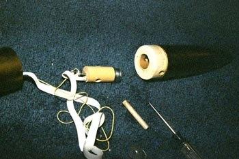 Drill a small pilot hole in the center of the top ring and into the hardwood plug. Screw one of the screw eyes into this hole and tie one end of the Kevlar string and elastic to it. Coil the whole thing up and tape it loosely to the top of the baffle to keep it out of the way while gluing the assembly into the airframe.