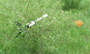 Flight two was the 3 x C6-5 flight I had planned from the start. The Taurus left the pad noticeably quicker and topped out quite a bit higher than on the three Bs. This flight went due west into the breeze as it accelerated off the pad, arcing toward a large grove of trees but never appearing to be threatened by them. The ejection charges were closer to true this time as they fired just as the rocket tipped over. It rode the breeze back, still quite high as it passed over the flightline. The recovery walk was a long one, and I found it stuck in a tree. Luckily it was a waist high tree.