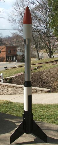I attached the fins to the bottom tube, dry fit the pieces together, and sprayed the whole structure with a coat of Valspar primer to toughen it for the sanding and sealing to come. Sealing was done using several coats of thinned Elmer's Fill 'n' Finish and the rocket was sanded after each coat.