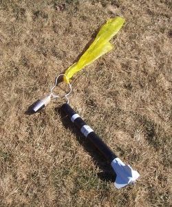 Shock cord from small diameter nylon rope/strap (recycled material). Nose cone made from Styrofoam already in cone