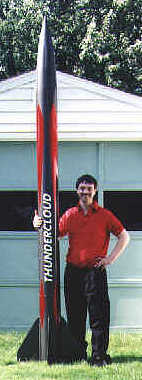 Rocket Pic"Thundercloud" is a 7.67" diameter High Power Rocket. It stands about 10-1/2 feet tall and weighs approximately 30 lbs empty. The airframe is Public Missiles craft-phenolic, the fins are 1/4 plywood, and the nose is carbon fiber.