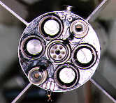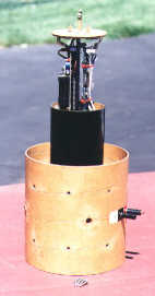 The four inch tube is supported by two 1/2" tubes crossing in the center and extending flush to the outside of the airframe. These supports double as static ports or 'vents' for the barometric pressure altimeters. Power and arming jacks are accessible from the outside of the rocket and are activated after the rocket is positioned on the launcher.