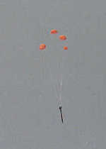 It reached apogee at about 16 seconds. It fell at 67.5 ft/sec under the slightly reefed 36" drogue chute until the mains hit at 63 seconds (750') which slowed it to 18 ft/sec. Touchdown was at 98 seconds landing only a couple hundred feet from the launcher.