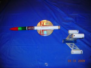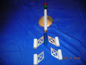 was cut off and turned around to become top to accept nose cone. 4 tube fins, mounted on struts. Balsa and cardboard