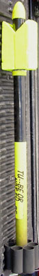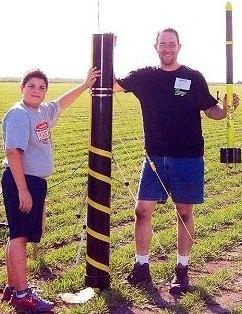 When assembled, the rocket with sabots could slide up and down very easily within the pipe. The pipe was secured with a series of conduit clamps held in place by 2 large threaded pipe straps/clamps. Through the conduit clamps, went tent guy wires and were pegged into the ground. A plywood disk would fit into the bottom of the tube to keep from scorching the grass. Holes were drilled in the bottom edge of the pipe in order to stick the igniter wires through.