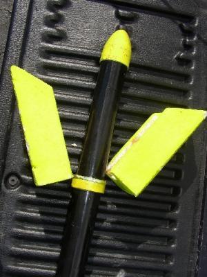 There was no launch lug or rail button! A piece of rubber hose connector was epoxied just forward of the CG. The flattest edge faced forward and had a 1/4 inch width around the airframe.