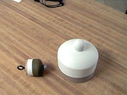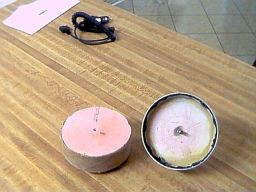 The nose cone tip was turned from 2" pink Styrofoam using a hand drill clamped in a vise. I first cut circles top and bottom with my Rotozip, and because the cuts didn't reach through the foam, finished up with a hand saw. A metal bolt epoxied into the core provided a sturdy attachment point for the drill. This worked better than a wooded dowel and I knew I'd need to add nose weight anyway. To extend the cone slightly, I cut a 3/4" circle from the bottom an oat bin. I glued this to the bottom of the cone. At this point, I coated the cone (without the plastic insert) with a layer of West epoxy. The 'nipple' portion of a cone is a plastic cap from something-or-another (it's been laying around too long for me to remember what).