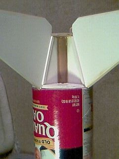 The shoulder is another foam disc encircled with a piece of an oat bin. I did not glue these sections together until I completed the rest of the rocket and determined how much nose weight was required. The required weight was determined by adjusting the CG of the completed rocket, including the motor and chute, based on the Rocksim model. The weight was provided by a long eye-bolt and several nuts. This eye-bolt is slightly off-center, and extends through the shoulder section and into the top of the nose. The two halves were epoxied together and the center hole was filled with some epoxy, some lead shot (just for insurance), and more epoxy.