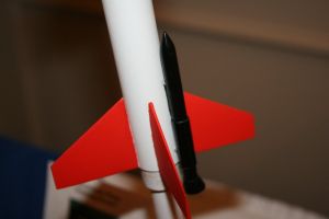 The booster is pretty straightforward. BT-20 marked for 4 fins flush with the aft end. Since this is gap staged to a 13mm sustainer, I wanted to use a stuffer tube so put a BT-5 into a 13/18 centering ring and used a spent motor to push it up the BT-20. I had added a forward centering ring about 1/2" back from the end and punched a couple vent holes at the top. The booster can generally tumble, but if you want a token streamer, it can fit in between the BT-5 and BT-20 if you leave a little more room by setting the forward 13/18 ring back more than 1".