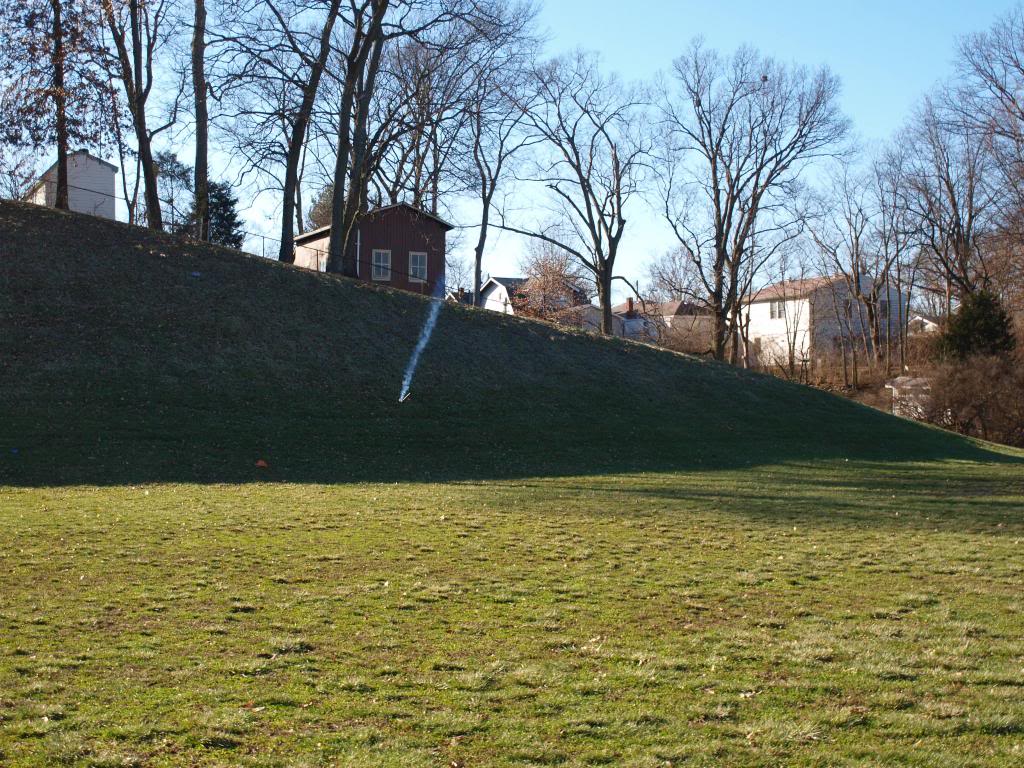 Several months later, just when things were turning green I got the Screw Loose out for a third flight, this one with ring fin support AND nose weight.  Flying again on an A8-3, this time I was rewarded with the corkscrew motion, however brief.  The flight topped out at around 150', popped the chute and drifted home to a wild celebtation and a date with the paint booth.