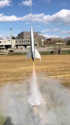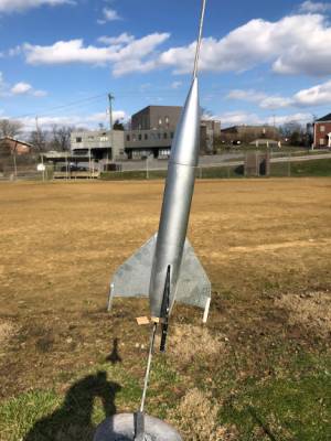 First flight in over ten years. Flew out over the girls' softball field, then rode the breeze back over to the third base line of the baseball field. Broke one of the launch lug fin tips.