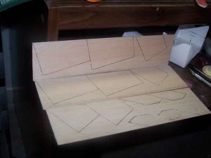 The balsa from which the fins were cut varied from fairly stiff to fairly delicate. I decided that instead of rounding the leading, trailing and outer edges, I would bevel them. Since this was bound to take a while, I decided to start on the double glue joint first.