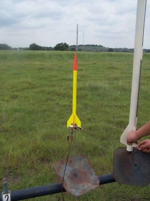 For the second flight I set up the two staged version. I used cellophane tape to join an A8-5 and a B6-0. These motors fit more snuggly and just needed a hint of tape to keep them secure. After calling heads up, I pushed the button and the igniter wasted itself without igniting the motor. I set it up again. I pushed the button. WHOOSH. It was gone.