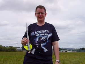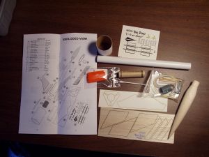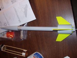 Brief: This is a small Sci-Fi looking model with forward swept fins, a ring fin and a bulging nose cone. Construction: The kit contains: Balsa Nose Cone Body tube (also serves as 18mm motor mount) Ring fin (body tube material) Sheet of laser cut 3/32 in. balsa fins - 6 all together, 3 inside and 3 outside ring fin Empty motor casing (spacer) Thrust ring ...