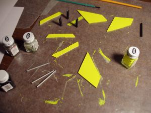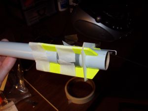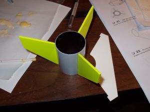 After all the filling/sanding was done I sprayed all parts with Krylon white primer. The smaller pieces were difficult to paint, as I didn't come up with a good method for doing it. I spray painted the tubes and nose cone Krylon Pewter. I brush painted the fins with Testors fluorescent yellow. I painted the base of the nose cone and cannons silver and inside of the ring tube black.