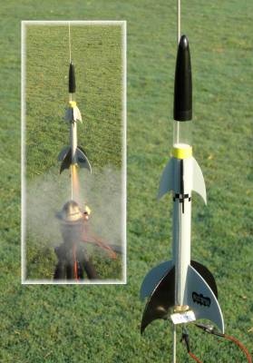Centuri design from the 1960s designed during the TV Batman craze. I finished mine like the Adam West Batman costume, complete with a yellow ulility belt band on the nose block coupler. This model hangs upside down during recovery so the fins don't get tangled in the shroul lines at ejection.