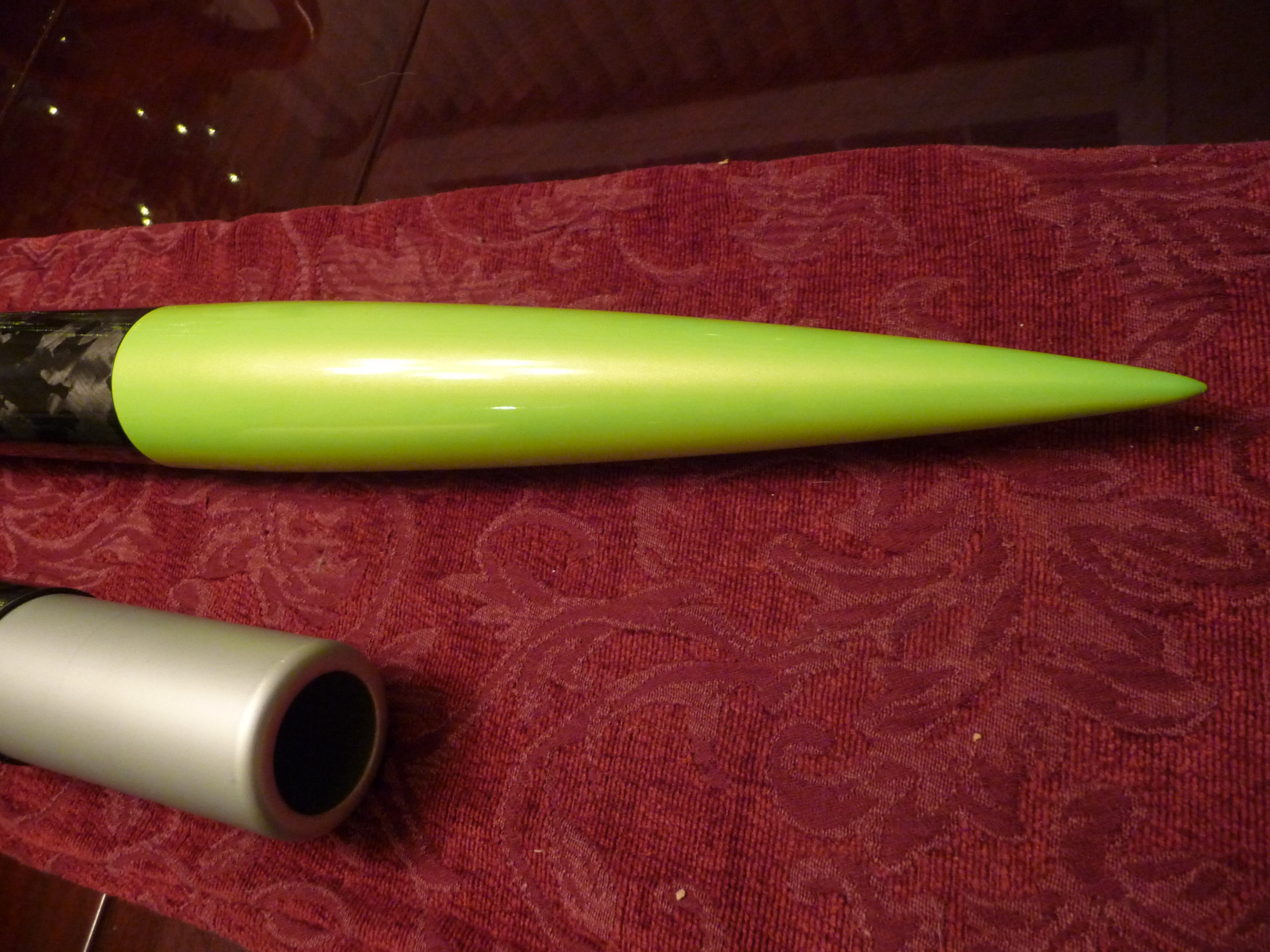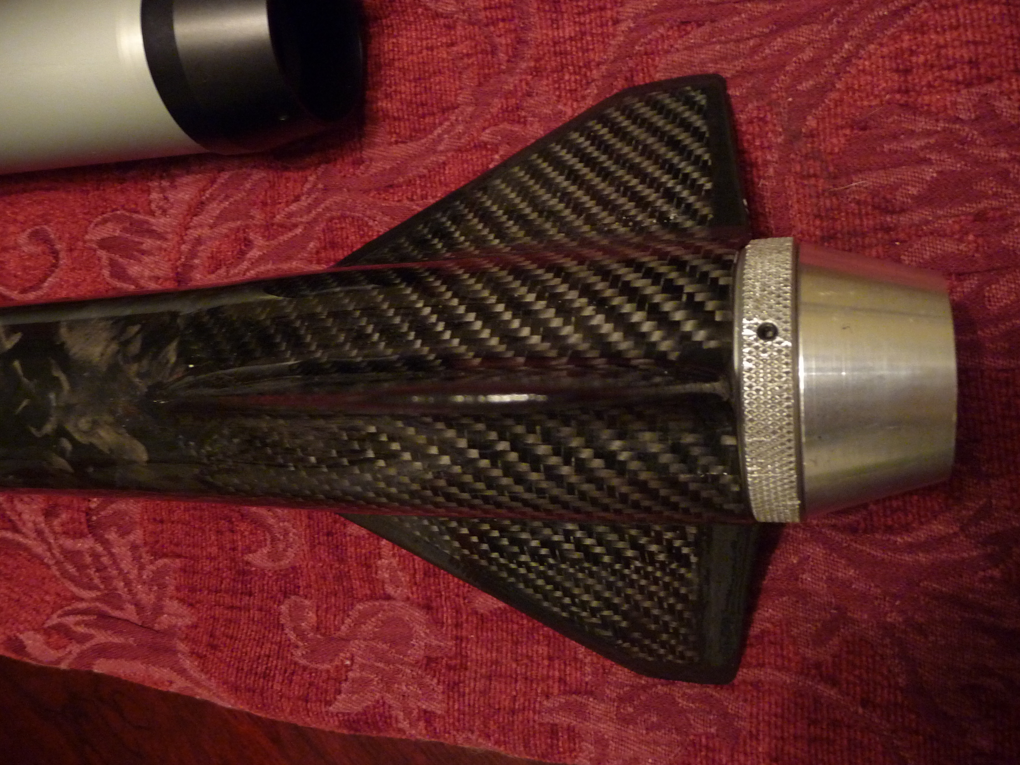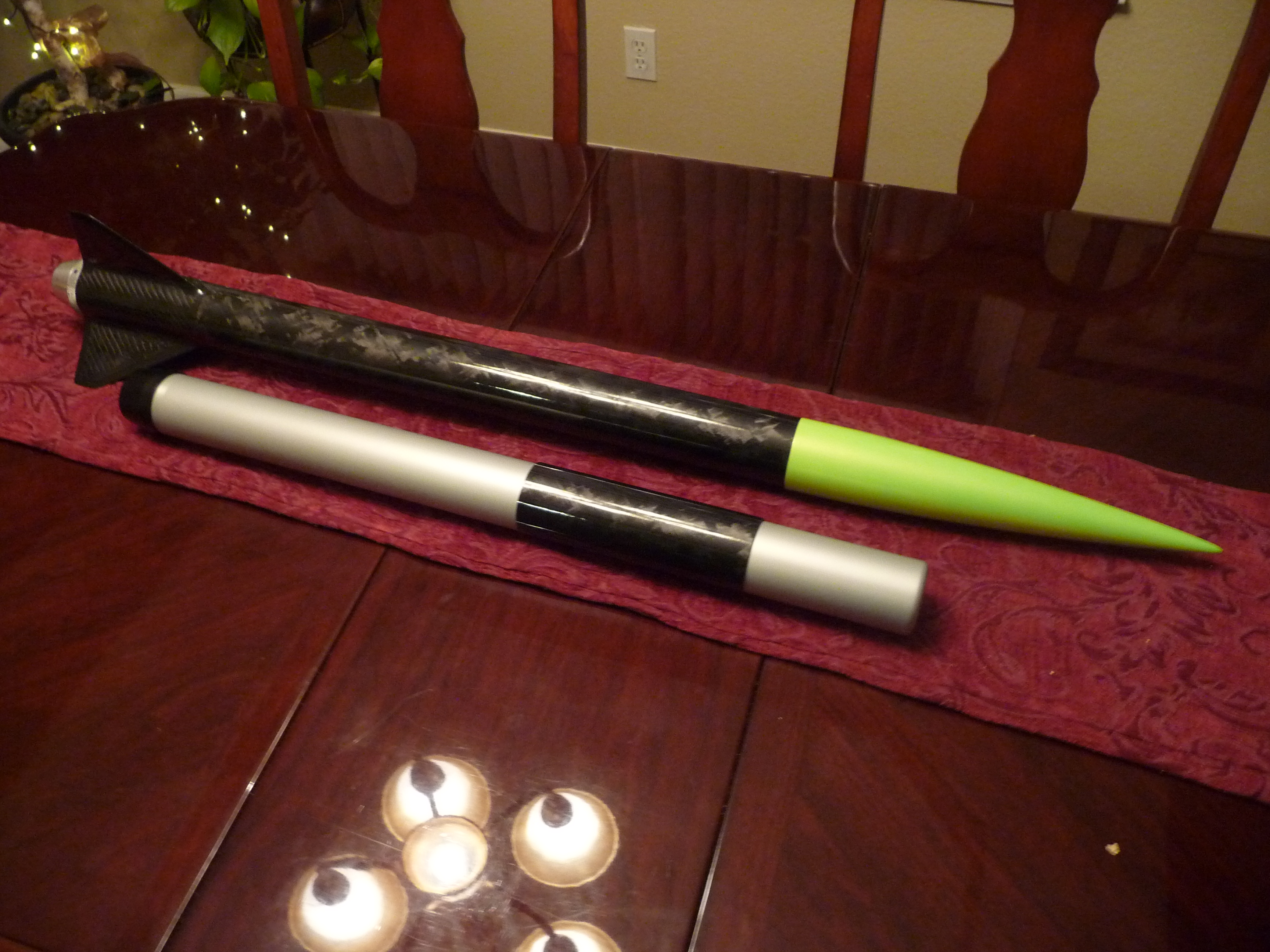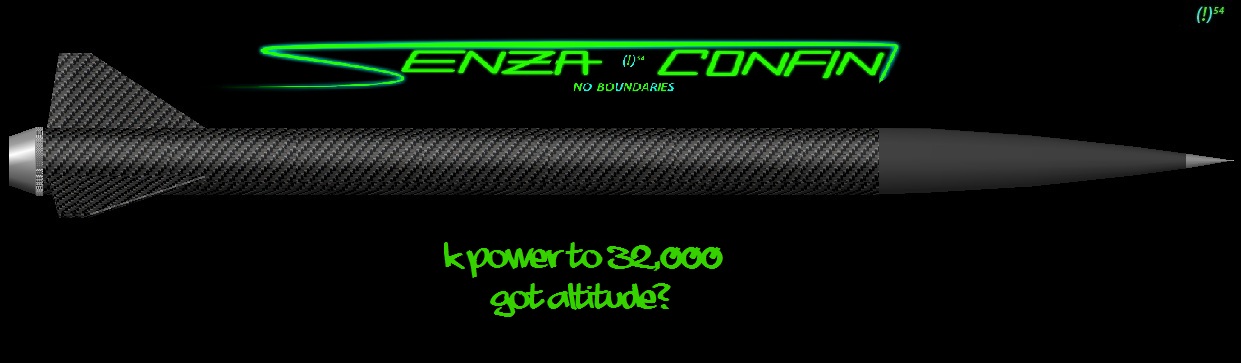 Senza Confini is a 54mm maximum performance rocket designed around the 54/2800 case from Aerotech, for the K250W. It is only 31 inches in length. It features a SUPERSHORT design, Tower-launched design, G12 Fillament wound nose cone, a T1000G Fillament wound Carbon fiber airframe, Dragon plate quasi Isotropic Carbon fiber fins, a custom designed and milled 6061-T6 tailcone, Dual deploy, and an automotive paint job.