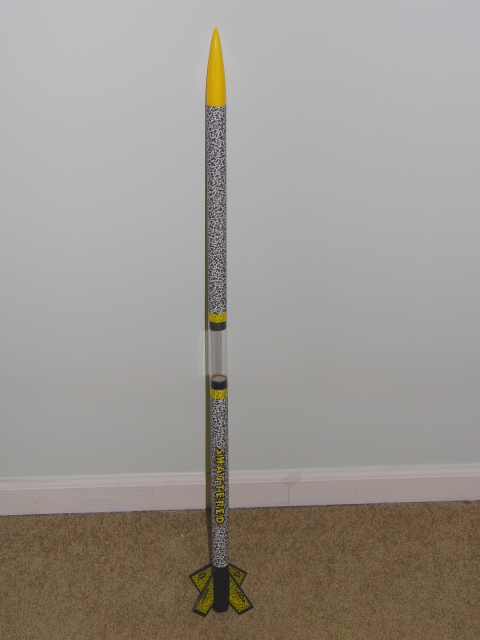 Shattered is an E2X 3FN payload rocket that has a pre-printed body tube that looks as if it's "Shattered". It also has a unique styled nose cone.