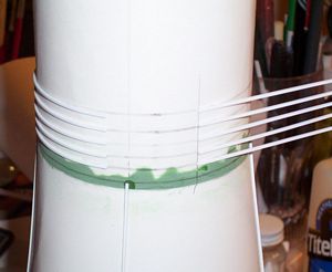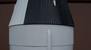 Like Sheri's Little Joe II and Saturn 1B kits, this kit uses corrugated styrene sheets to simulate the external stringers. The corrugated sheets are pre-cut to the appropriate width, although with a main body tube circumference of over 25 inches, it is necessary to glue three sections of styrene together to get the necessary length (using pieces of the 0.010" styrene as a doubler). Attachment of the wraps was similar to that for the Apogee Saturns: taping the wraps in place then using CA to seal the edges to the body tube.
