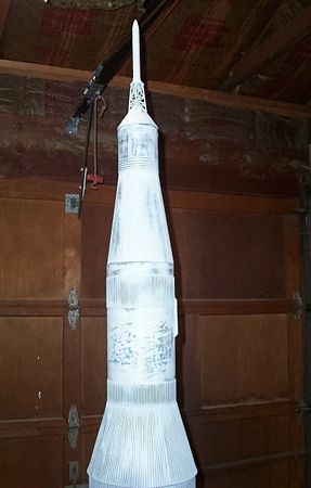 As previously noted, Sheri's kits do not include recovery components. Although she recommended two 55"-60" parachutes for the lower section, I ended up going with a single 90" X-form chute, connected with a generous length of nylon strap. For the upper section I went with the recommended 60" chute with a harness to hold it horizontal to protect the escape tower on landing. After my less than successful experience with the Saturn 1B harness, I decided on overkill. I drilled a hole through the top of the upper stage and the upper transition coupler, epoxied a nut inside the coupler, and threaded a (removable) eye bolt through to attach the harness. It also acts as a positive retention for the upper transition and Apollo capsule.