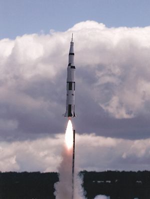 First flight was at "Fire in the Sky 2009", better known as FITS, a major high power launch held in central Washington over Memorial Day weekend. Showing up at pretty much any launch with this rocket will make you a center of attention, and FITS was no exception. As previously mentioned, the rail buttons proved to be an issue when the launch rail wouldn't clear the fin fairings. (To help hide the black buttons I'd centered them in the black section of the roll patterns.) So there was a false start and a minor thrash while I relocated the rail buttons. But finally everything came together. Liftoff of a big Saturn V is spectacular, and this was no exception. There was a slight weathercock off the rail (remember that marginal velocity off the rail) but the flight was spectacular. I'm not sure about the altitude. RockSim said 610 ft, but it didn't look that high to me. Perhaps my perception was fooled due to the large size. At any rate, ejection occurred a moment after apogee and the chutes opened shortly there after. There was a minor problem: the lengthy shock cords for the upper and lower sections become entangled so the two sections came down together. The main concern was that the entangled shock cord had the effect of reefing that big main parachute, so descent was a little more rapid than I would have liked, however, touchdown damage was minor. The most serious being one fin being snapped off.
