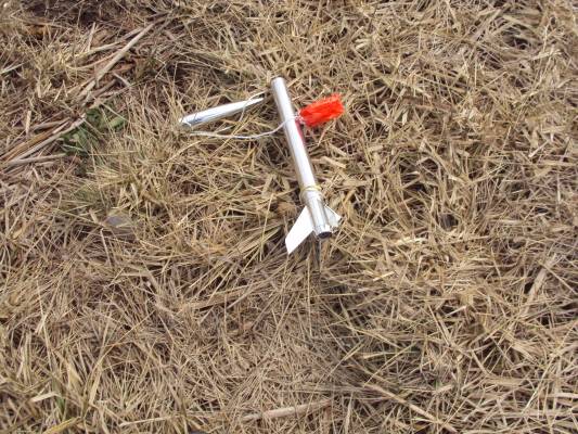Temperature: 31 degrees, partly cloudy, low wind. First test of 12V launch controller. First launch of Silver Streaker with Estes C-6-5. Had onboard camera mounted with rubber bands. Parachute did not deploy and rocket crashed in a gully about 20 yards east of the launch site. One fin was broken and the onboard video camera did not record.