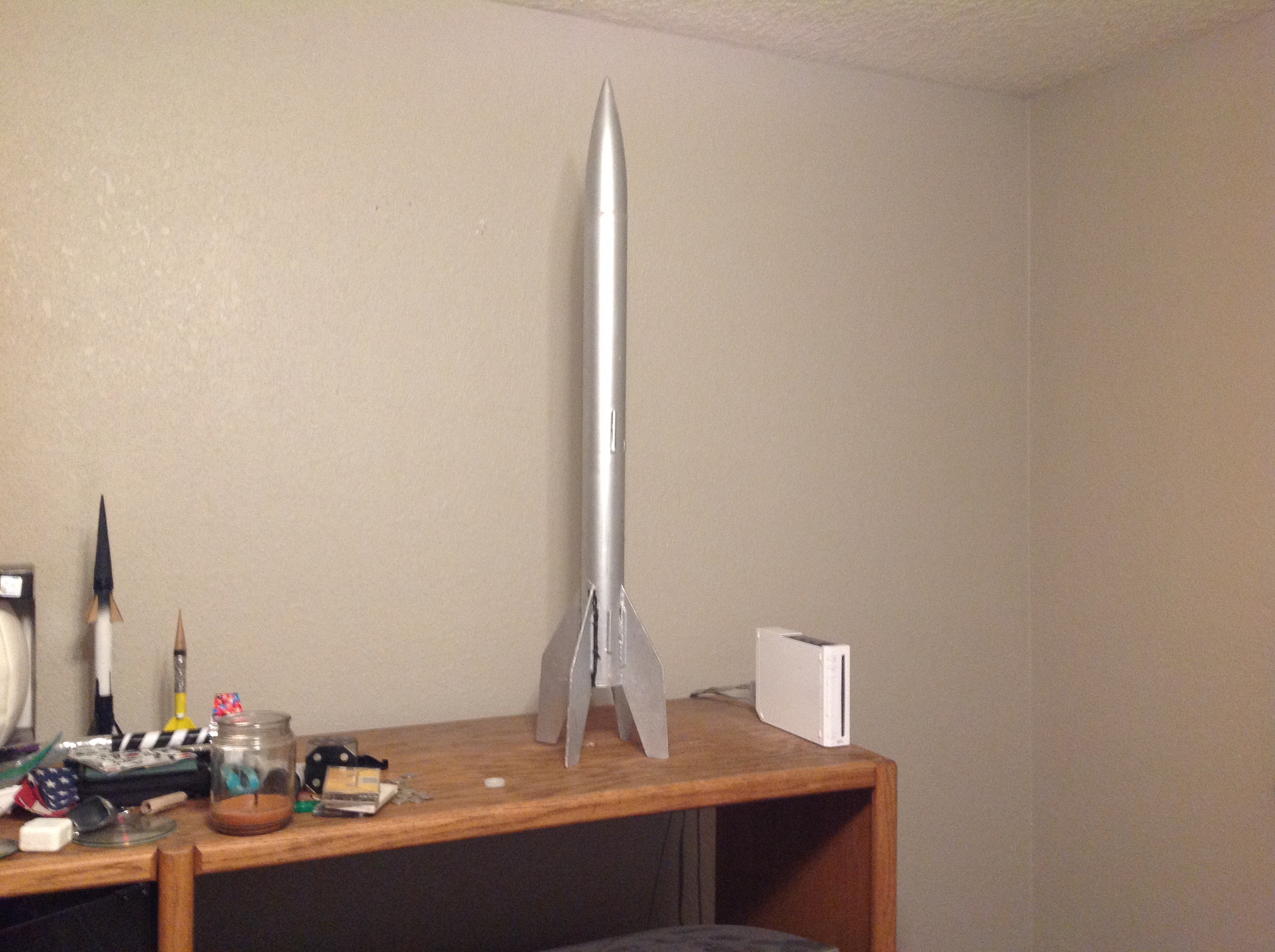 A semi scratch build rocket I call silver surfer. I used to Estes airframes that I coupled together 2 bt-80 body tubes, used a 24mm 18 inch tube I found in a take what you need bin at a local launch. Cut the centering rignus, cut and motor half an inch thick and used that as an engine block, took an engine hook from a Non repairable kit that crashed, the nose cone was given too me by someone at a launch, then I bough some sheets of eighth inch balsa, and decided to use the big Bertha fin shape because they add a lot of stability and drag to the rocket because I wanted a slow and realistic flying rocket. it flies a little bit tilted to the left, but not bad, the trajectory is always straight. It flies too about 500 feet on D's, I'm going to remove the engine hook and install a motor retainer so I can do composite Es and even some 24mm Fs. One of my favorites in my fleet.