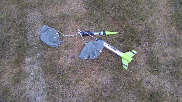 Launched with camera in payload. Good flight. Arced towards 120 degrees. Both parachutes deployed and opened. Daniel recovered 60 yards, 120 degrees from launch site. No damage. Camera recorded flight.
