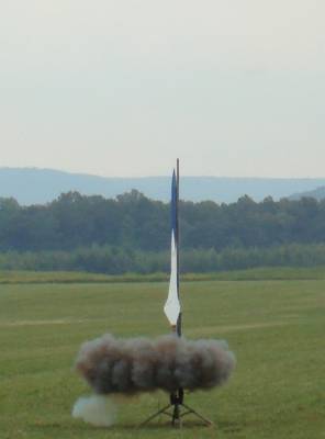 First I motor flight! Beautiful boost, straight, fast and high. 15 inch drogue at apogee, good main at 500 feet. Fair amount of drift, grass landing, no damage