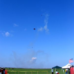I chose an AMW 1350 White Wolf for the cert launch at the 2007 Florida Winter Nationals. The boost on the AMW 1350 White Wolf was fantastic. The altitude reached was 4340 feet which was more than I expected. The drogue charge may have been a little early. I cannot tell if the first charge was an altimeter or from the timer. The main and nose cone chutes deployed for a nice descent from about 1000 feet. The rocket was recovered only about 1/4 mile from the pad with no damage. I now have data from the PerfectFlight altimeter which will help me set the timer for future flights. It was closer to apogee that I planned. I want the altimeters to deploy the drogue and use the timer as a backup.