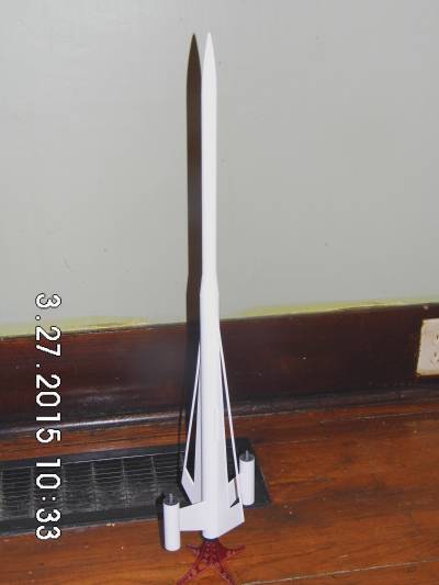 Added 2 final decals to fins then took rocket out to garage to clear coat. For the clear coat I will be using the infamous Dupli-Color Clear Effex paint which has become my trademark finish. Weather man is calling for 100% humidity today but I want this rocket done incase the club launch is a go for this Saturday (04-11-15) with J.M.R.C.. Needless to say results are less than perfect. Paint keeps trying to fog. May have to wait for better weather to do final finish but otherwise Solar Surfer is deemed ready for flight.