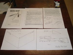 The plans can be found on Ye Olde Rocket Plans. They consist of five pages with two pages of 1:1 scale drawings on the balsa parts and two sheets of instructions. The pieces needed to build the Mini Bat are