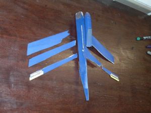 The instructions tell you to make the elevons by cutting halfway through the wood on the trailing edge, however, I found it easier to cut the elevons completely out at this stage, and tape them back in later. The two wings are glues together so that the tip of one of the wings is 3 inches off the board where the other wing it taped flat, I used a block of Plasticine to achieve this. Leave the joint for as long as possible to ensure a strong bond.